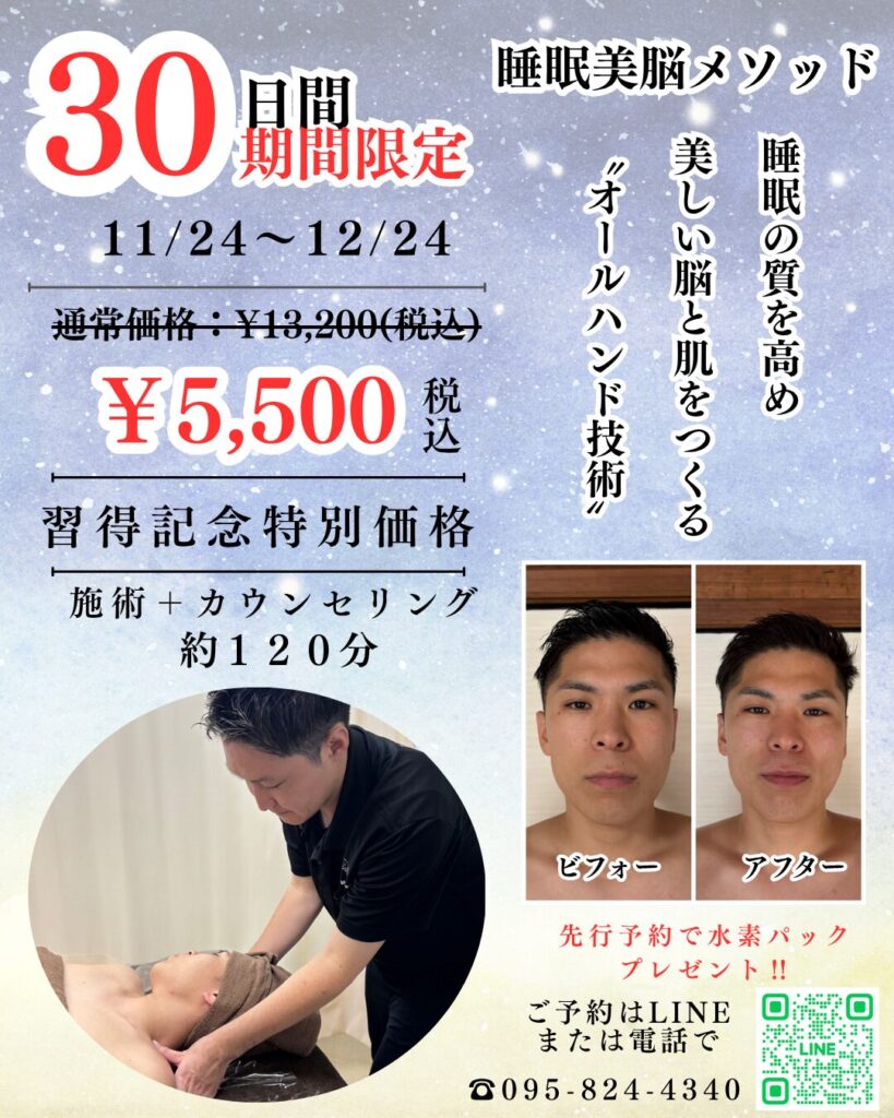 睡眠美脳メソッド(期間限定キャンペーン)先行予約11月23日まで! 投稿日 2025-10-22 著者 hayashida カテゴリー お知らせ 睡眠の質を高め、“美しい脳と肌”をつくるオールハンド技術。心身ともにリラックスしながら、顔のむくみや疲れをスッキリ整えます。 🗓 期間限定:11月24日〜12月24日💆♀️ 施術+カウンセリング 約120分💰 通常13,200円 → 【特別価格 5,500円(税込)】 さらに、先行予約で水素パックをプレゼント!睡眠の質を整えたい方、顔のむくみ・たるみが気になる方におすすめです。 📲 ご予約はLINEまたはお電話でお気軽にどうぞ。📞 095-824-4340